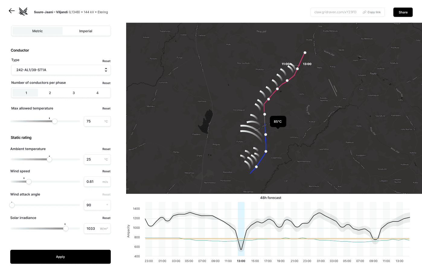 As high-voltage powerlines throughput depends on weather conditions; they needed a way to manage throughput based on weather data. Power grids traditionally rely on static ratings, leaving significant unused capacity. This limitation restricts renewable energy integration, increases operational costs, and slows decarbonization efforts. GridRaven needed a clear, visual way to demonstrate the advantages of dynamic line ratings (DLR) to potential customers and investors.